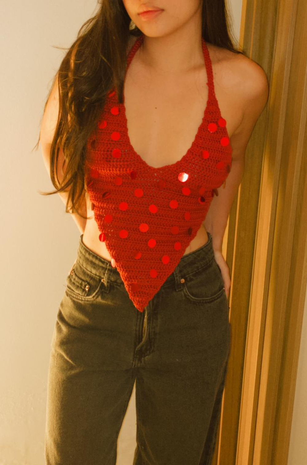 Top cheio de lantejoulas que traz brilho e sofisticação ao look. Possui ajuste nas costas, garantindo conforto e perfeita adaptação ao corpo. Uma peça artesanal elegante, perfeita para quem quer se destacar com estilo e personalidade.